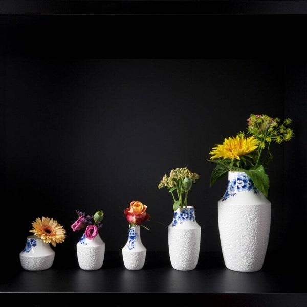 Deze vaas komt uit de Blauw Bloesem collectie van Debbie Wijskamp. De inspiratie voor de vazen haalt Debbie uit haar liefde voor schoonheid in imperfectie. Door contrasterende structuren te gebruiken, vergroot de schoonheid van het geheel. Net als een ruwe steen die schitterend edelgesteente meedraagt aan de binnenkant.